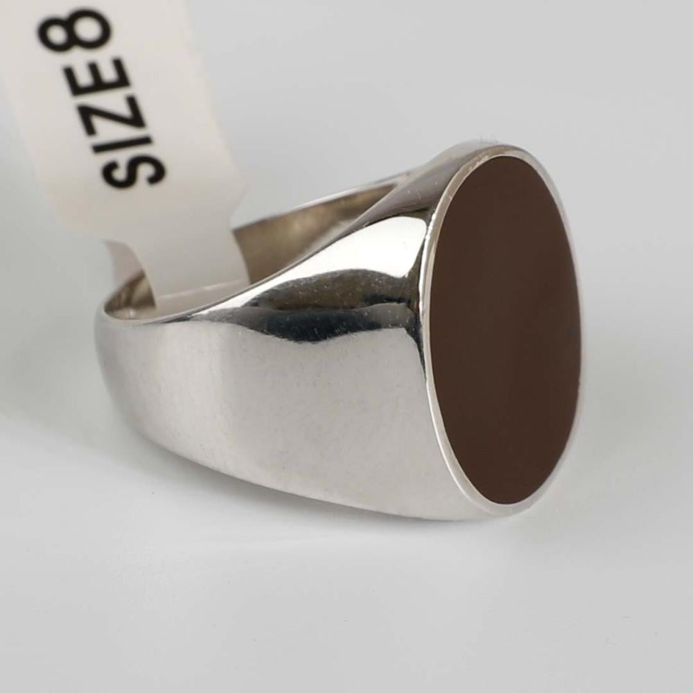 يتزين الخاتم بحجر اونكس بشكل دائري باللون بني